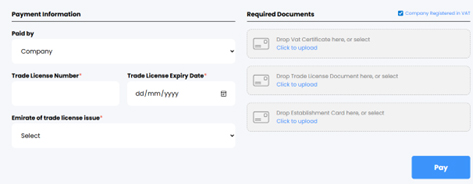 - Upload Trade License, VAT Certificate, Establishment Card.